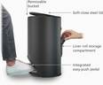 This stylish, circular bin has a large pedal that fits neatly within the footprint of the design, saving valuable floor space. Additionally, it features an integrated storage compartment at the back for liners, making them easy to access when needed. Finished in stylish carbon-black steel, it has a capacity of 10L (2.6 US Gallons).