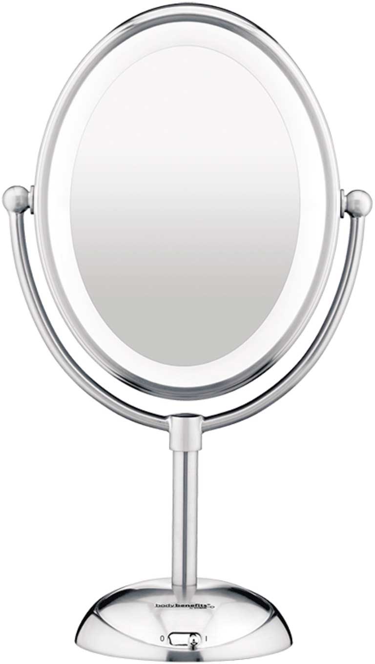 Double-sided mirror with LED bulbs for everyday use, expert makeup, skin care and contact lens application.